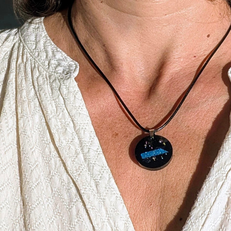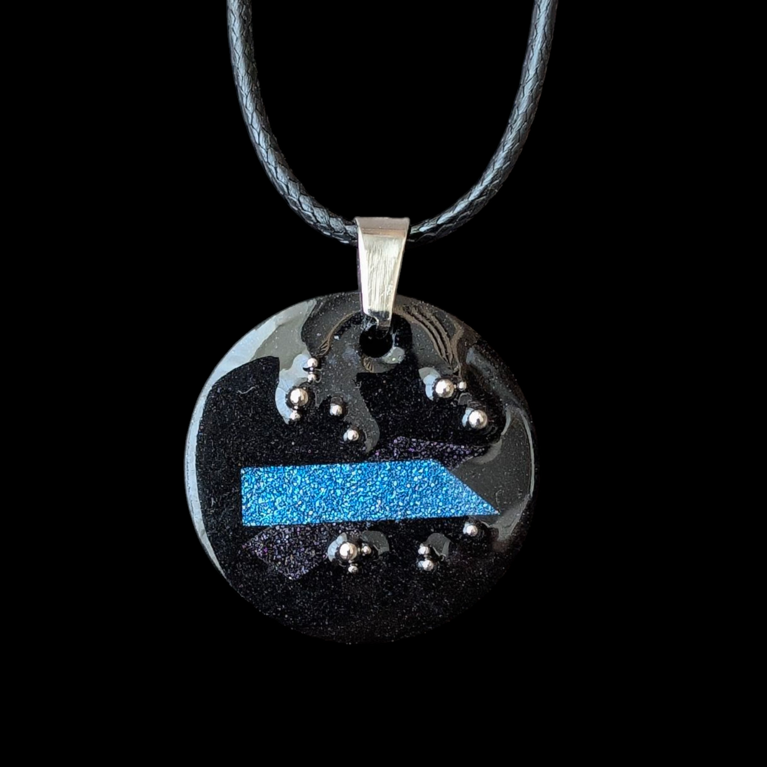 Tiefschwarz funkelt ein zarter blauer Strich zwischen silbernen Perlen.