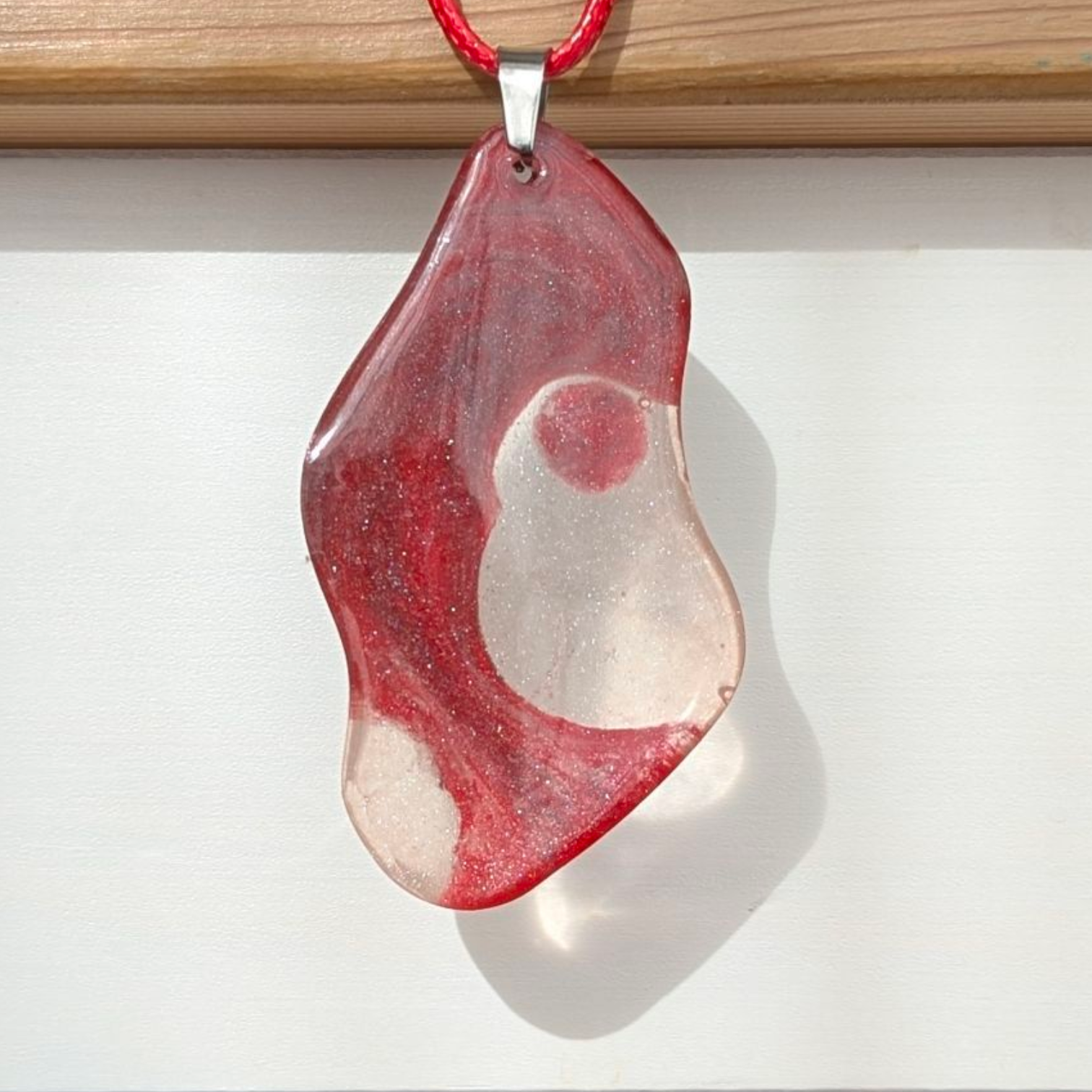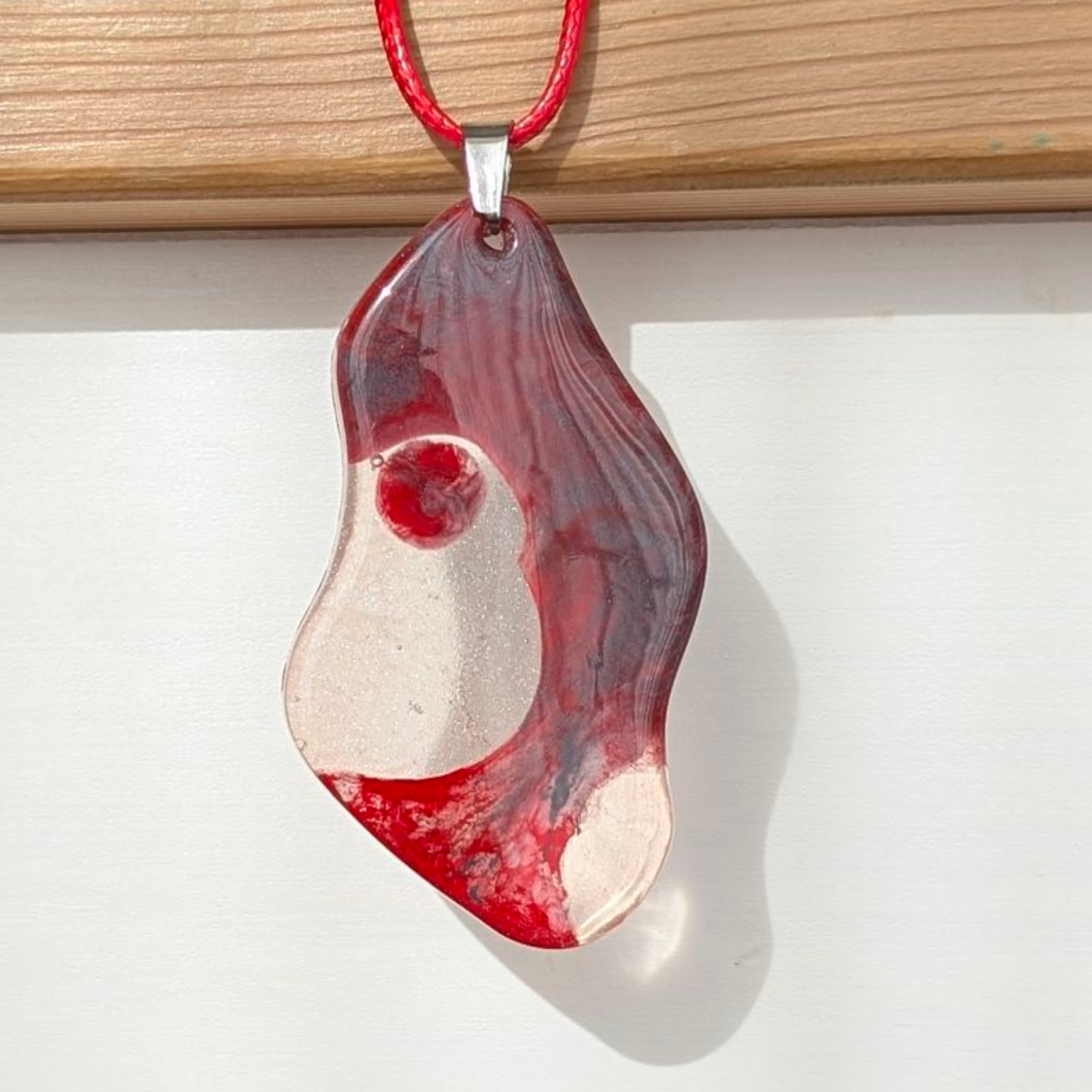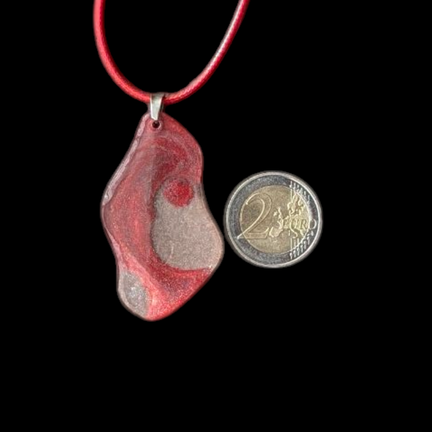 Matière : Résine époxy et résine UV. Cordon en coton ciré, fermoir et chainette en métal.