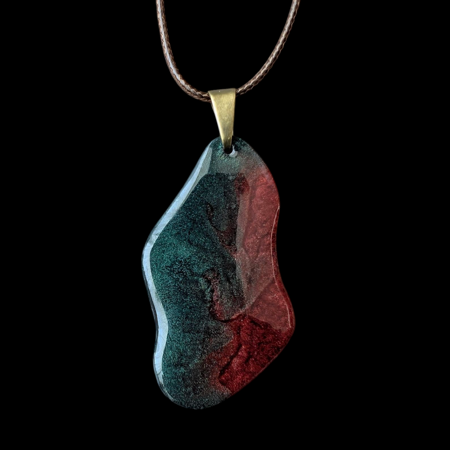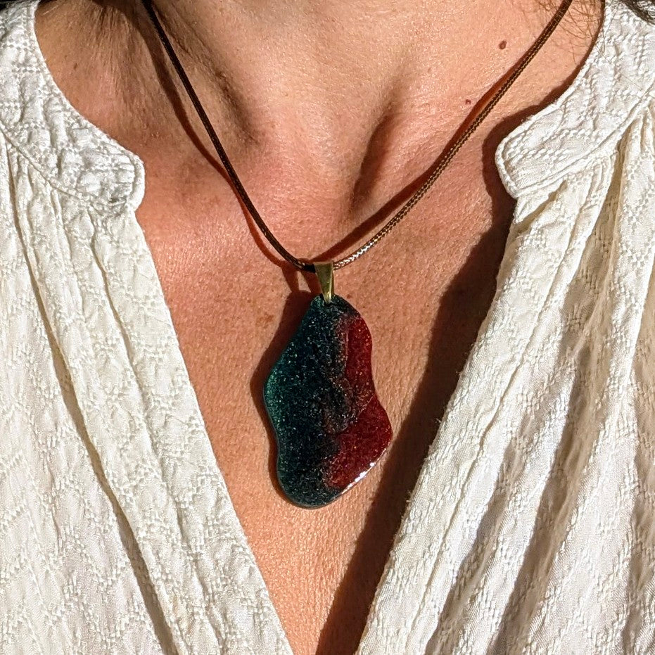 Matière : Résine époxy et résine UV. Cordon en coton ciré, fermoir et chainette en métal.