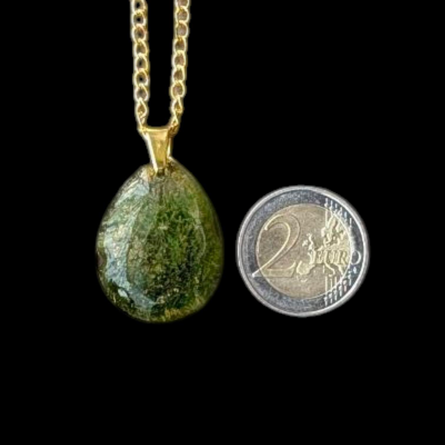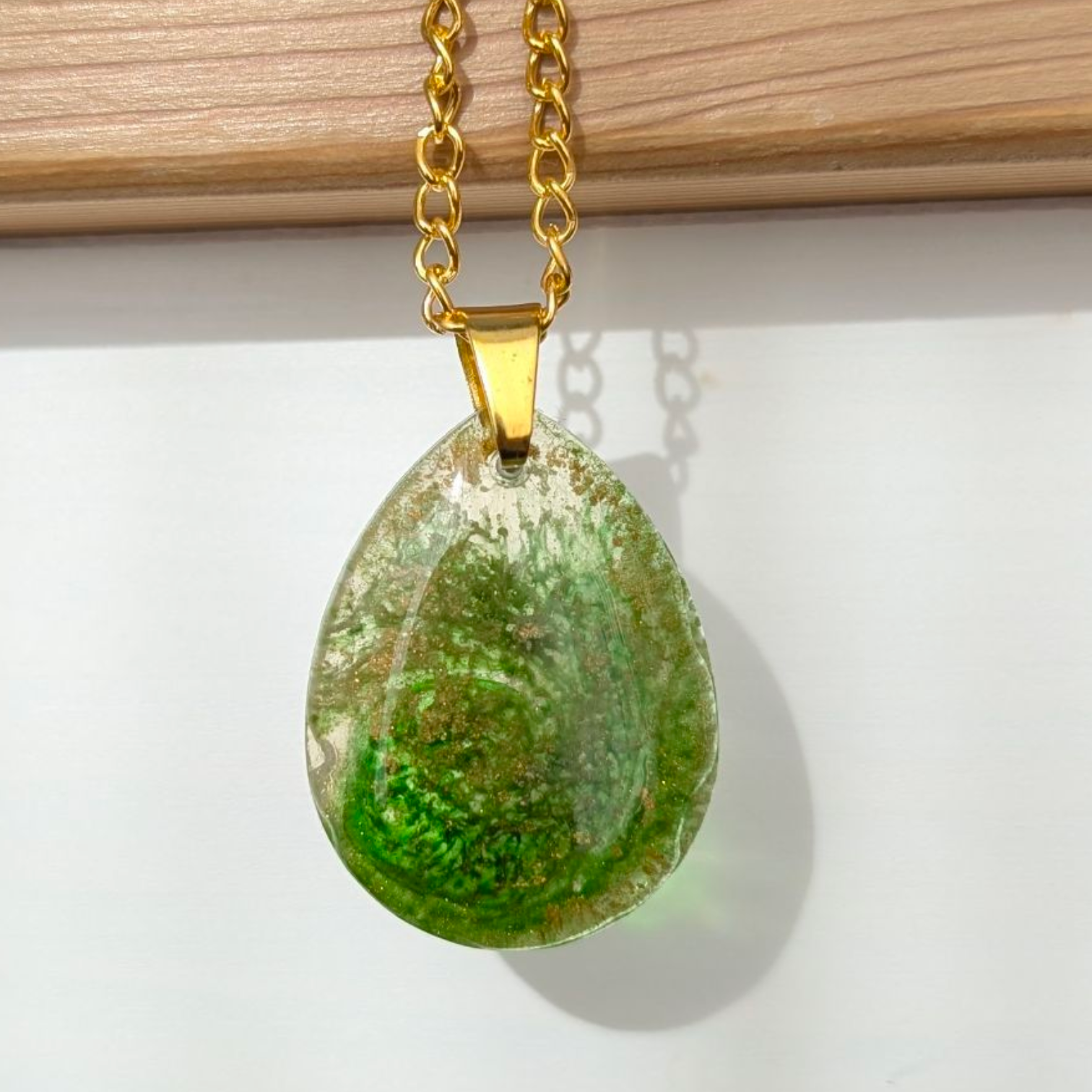 Vert profond et doré se mêlent dans ce pendentif délicatement transparent. Sa chaine dorée lui ajoute une touche d'originalité.