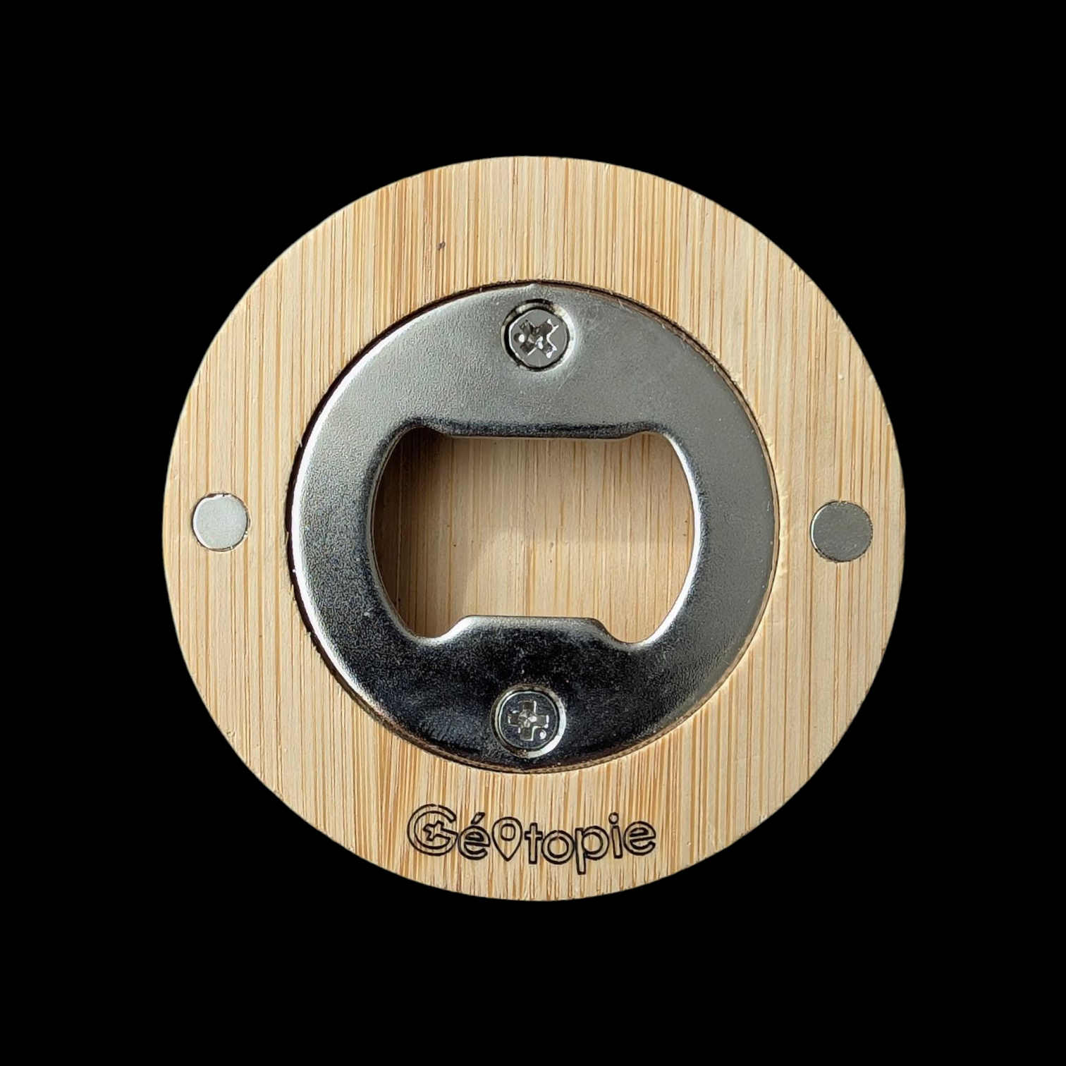 Le décapsuleur en métal est vissé dans un rond en bambou. Deux petits aimants permettent de le fixer sur les surfaces métalliques - toutefois je ne recommande pas de l'accrocher à la carrosserie de la voiture. 😁