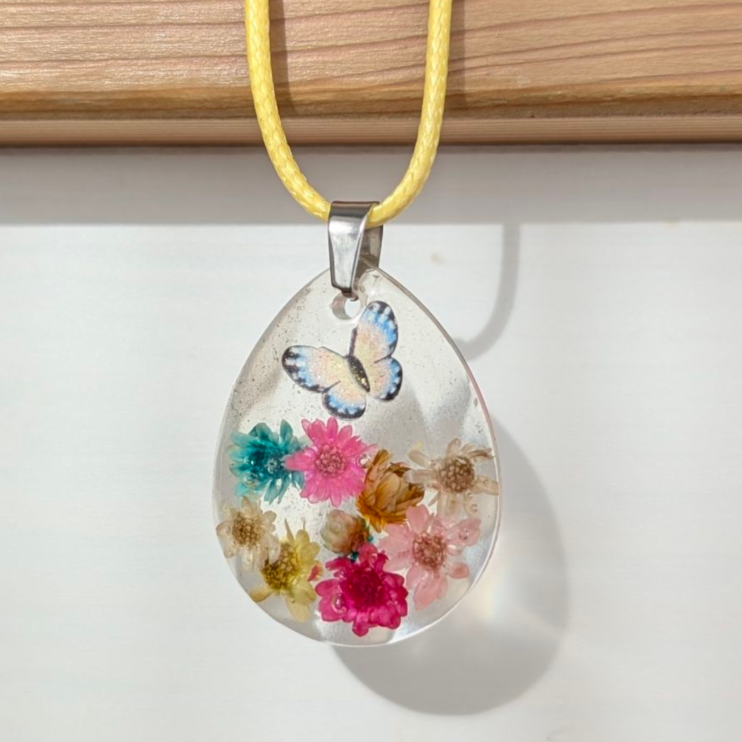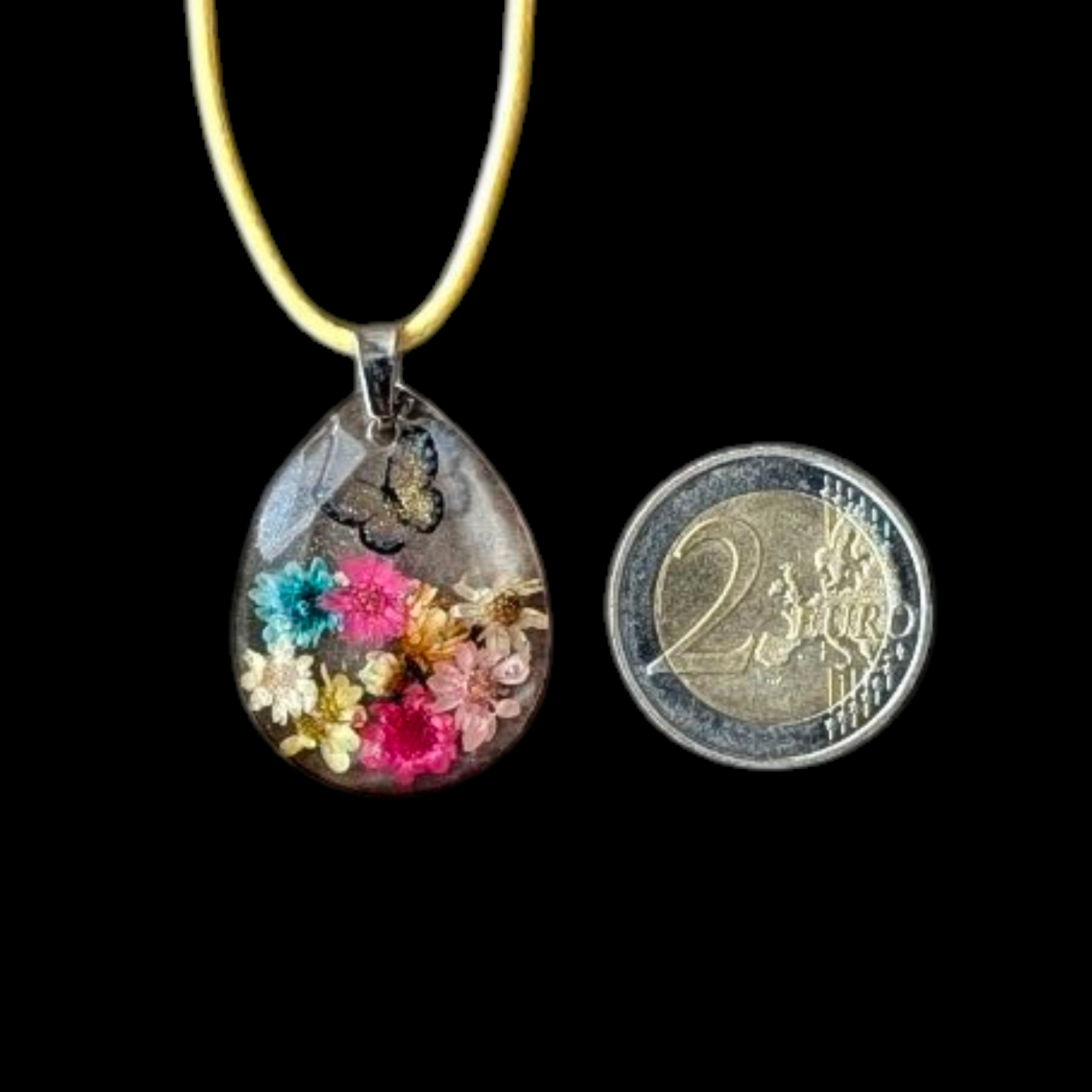 Celui-ci, transparent comme un diamant pur (mais il est en résine, hein), met à l'honneur un papillon qui vole gaiement au dessus de fleurs naturelles. Oui, ce sont de vraies fleurs colorées ! Avec son cordon jaune, il évoque - à mes yeux - l'été et la joie de vivre.