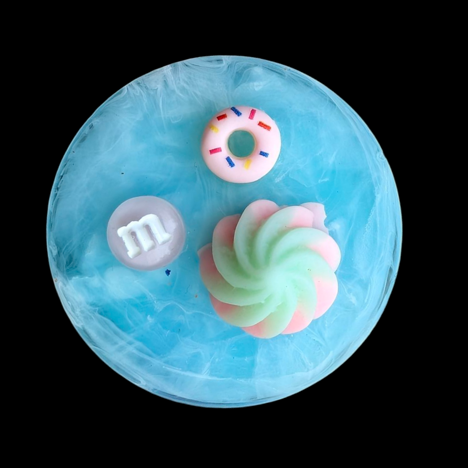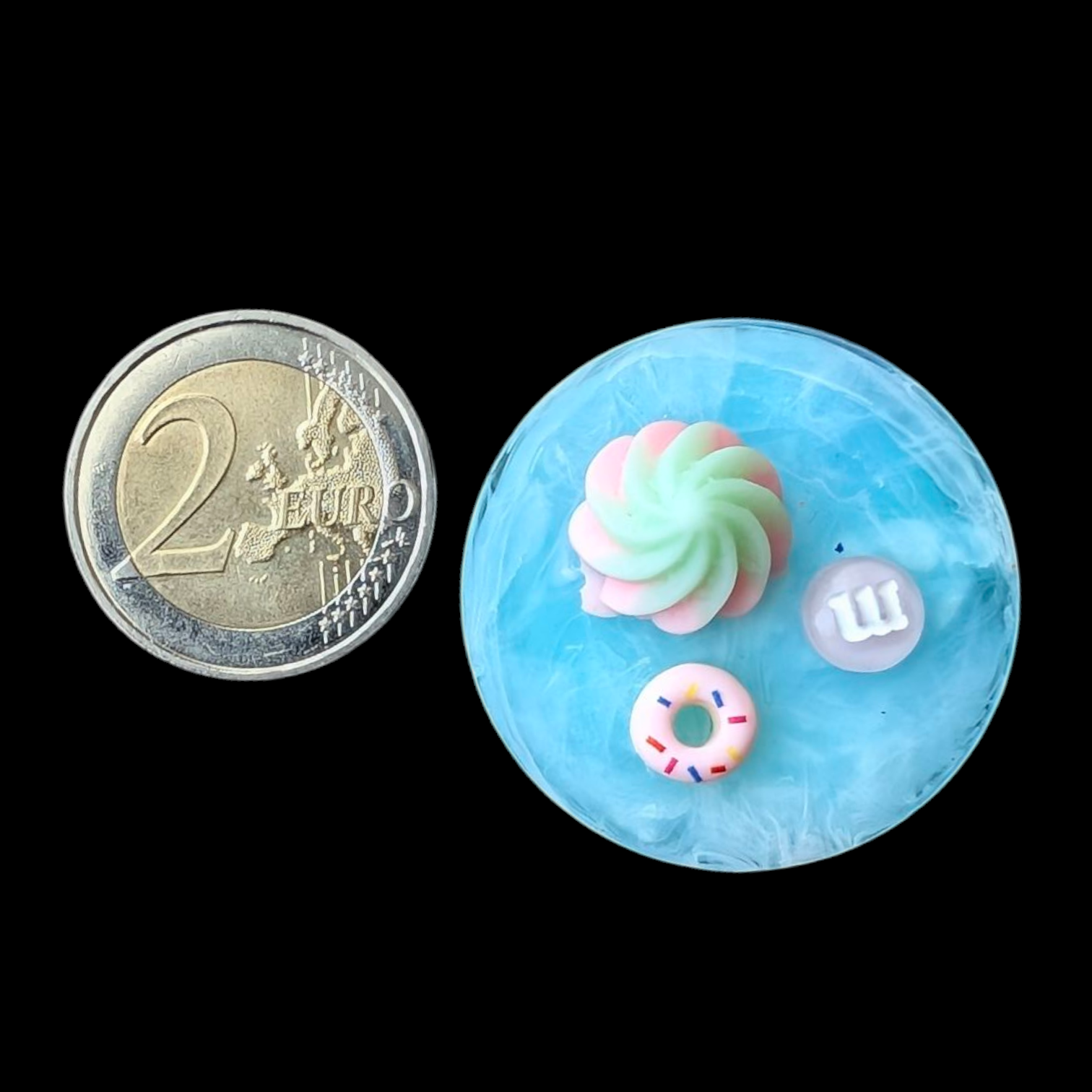 Sur une base glacée, petits gâteaux et bonbon invitent à une pause sucrée. Oui, mais non : ça ne se mange pas, ça voyage de cache en cache !